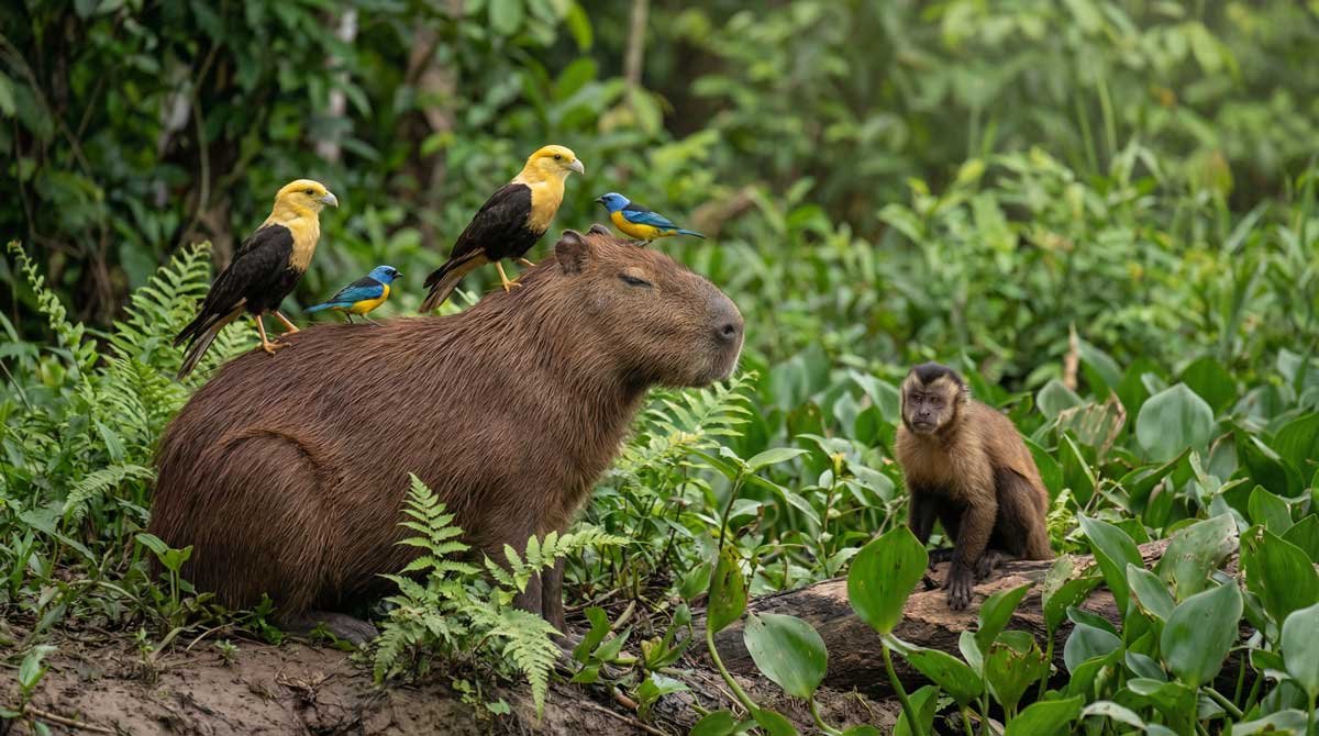 The capybara’s calm demeanor makes it a trusted companion for birds, monkeys, and many other species.