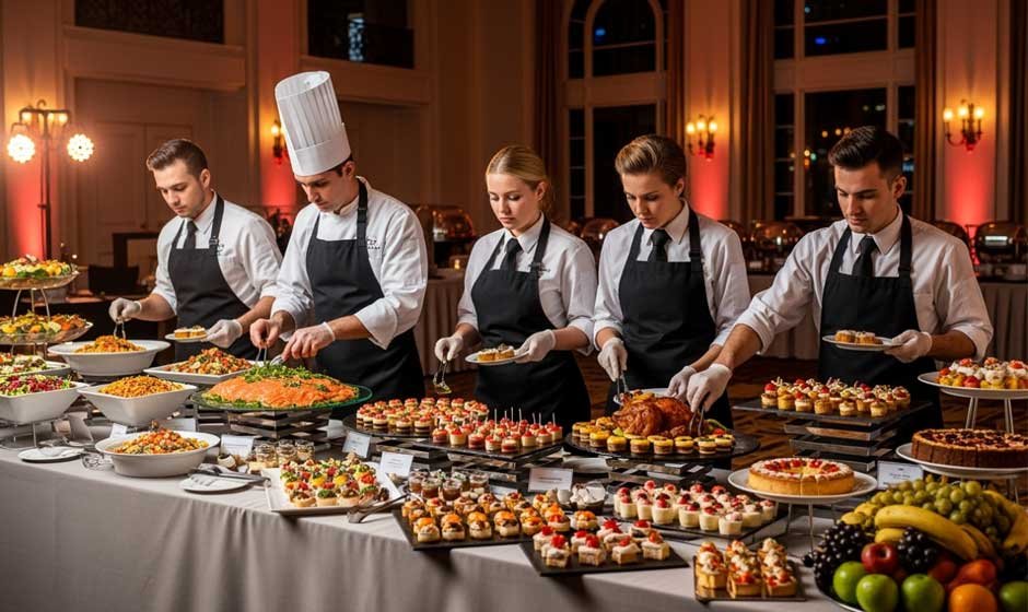 • Setup & Cleanup: The caterer handles the arrangement of food stations, dining tables, and decor related to food service, as well as post-event cleanup.